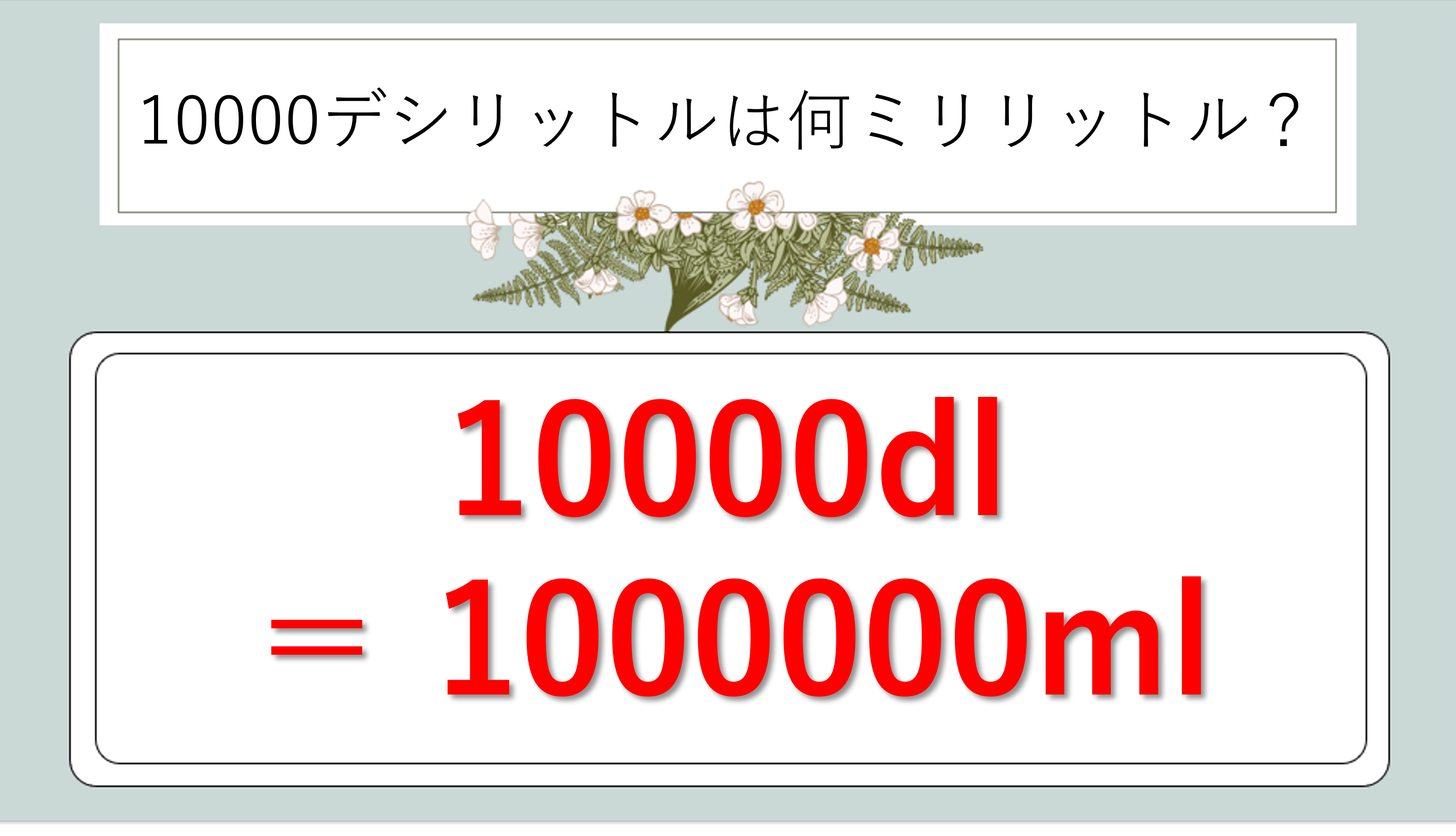 10000デシリットルは1000000ミリリットル(10000dl=1000000ml)