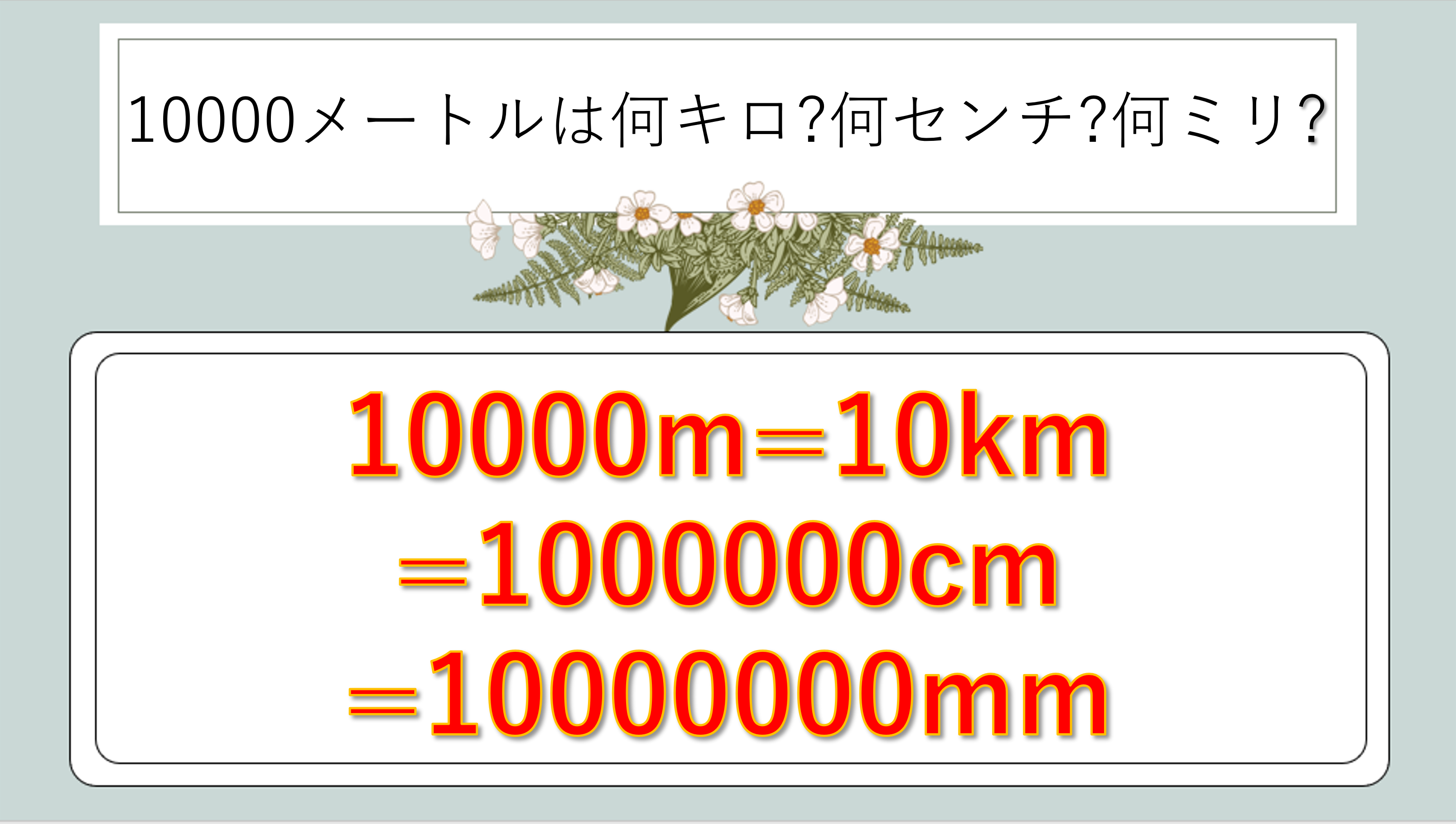 10000メートルは10キロメートル、1000000センチメートル、10000000ミリメートルに換算されます。
