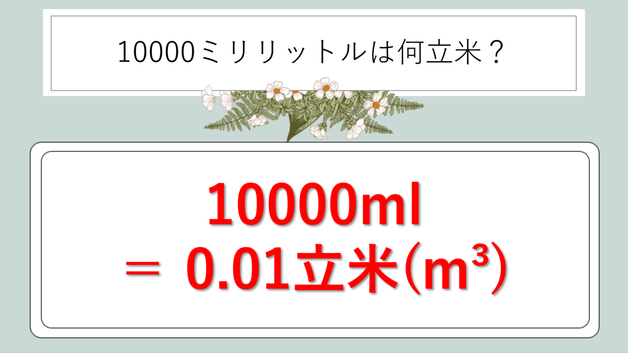 「小数点を6つ左に動かす」というイメージを持つだけで、電卓を使わなくても頭の中で答えを出せるようになります。10000mlは0.01立米(㎥)——これが今回の答えです。10000mlという数字が0.01㎥という非常にスッキリした数値に収まるのが、この変換の面白いところでしょう。