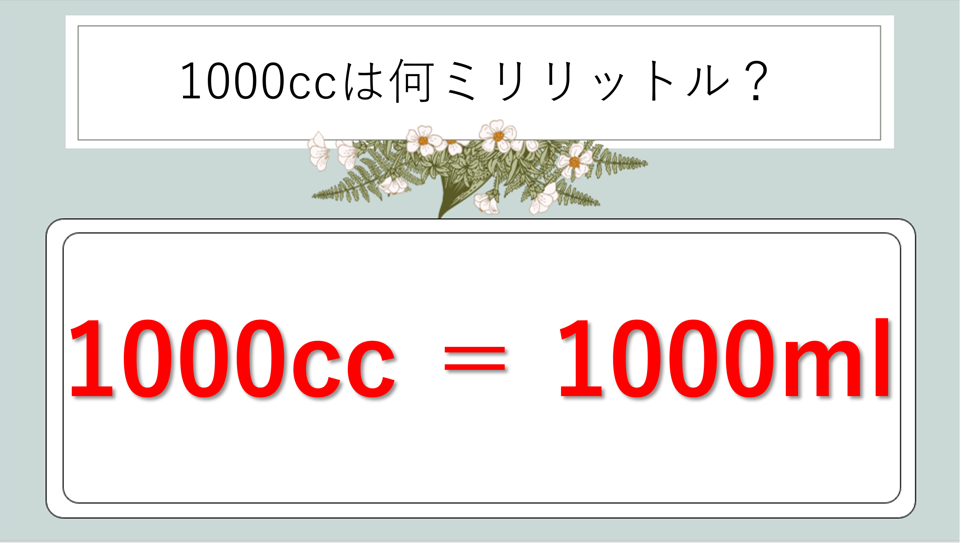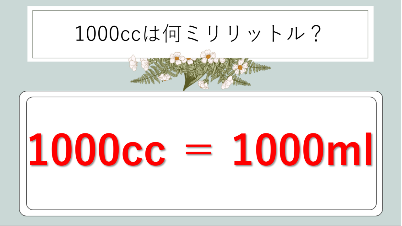 1000cc=1000ml!ccとmlは完全に同じ単位です。1cc=1mlが大前提。数値の変換は一切不要です。そして1000cc=1000ml=1Lという関係も同時に覚えておきましょう。