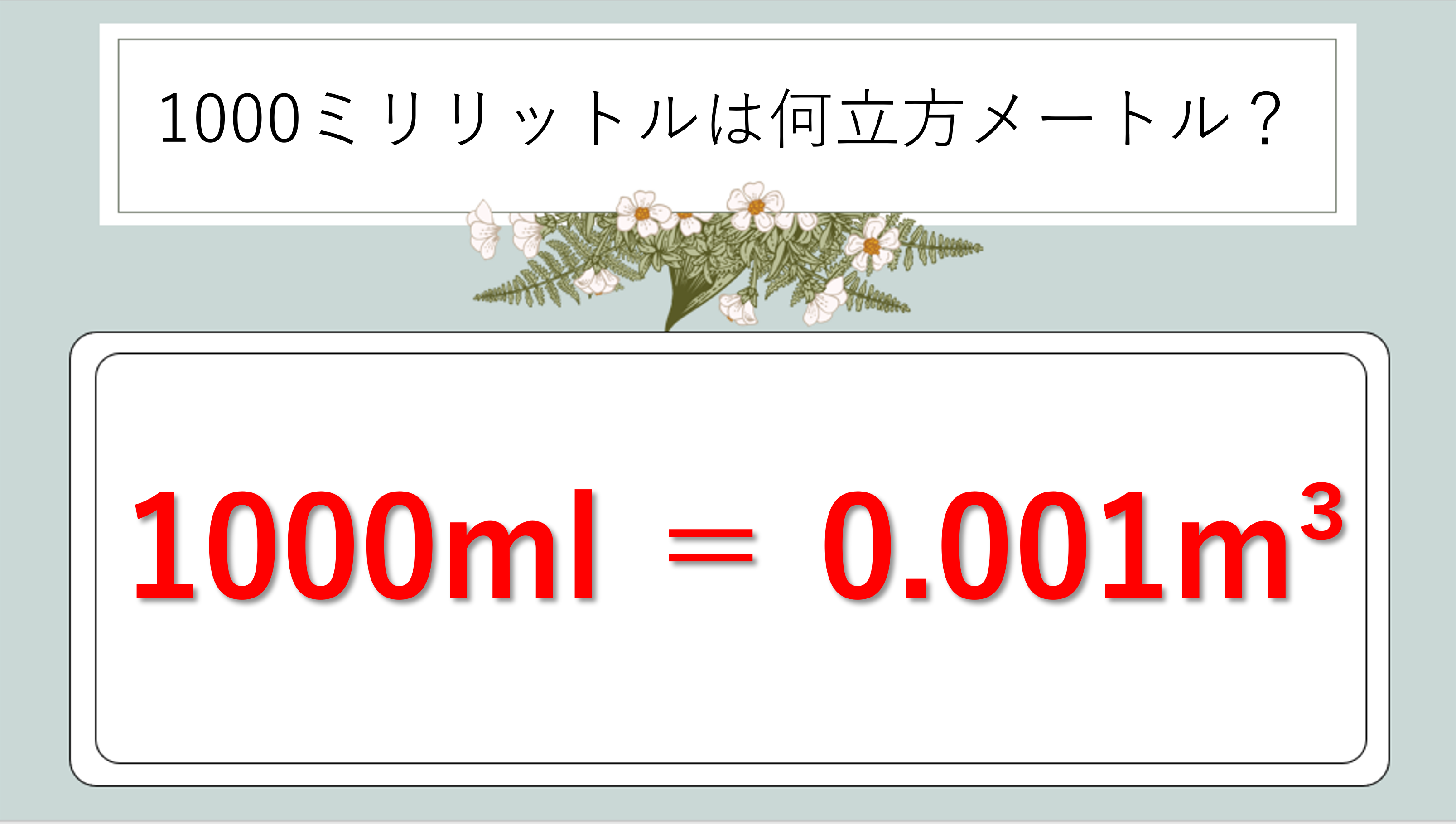 ズバリ、1000ml=0.001m3です。小数点の多い数字に見えますが、変換の仕組みを理解すればとてもシンプルな計算です。