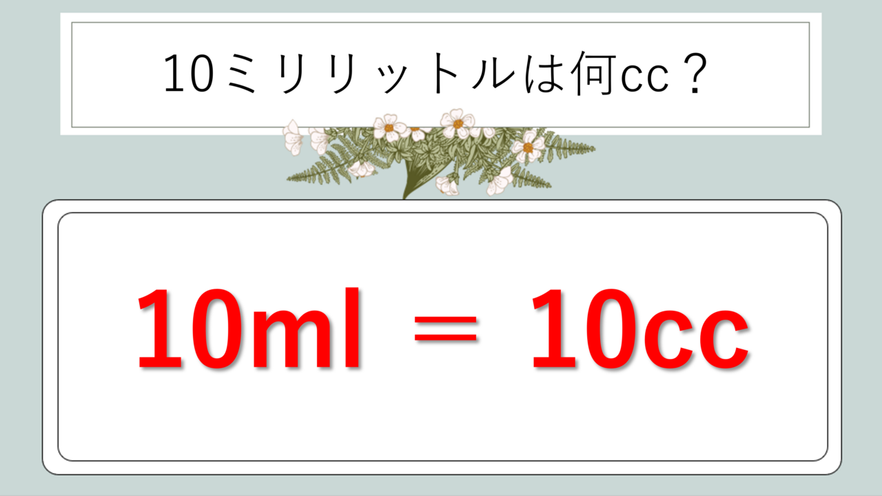 10ml = 10cc この関係は1:1で常に成り立ちます。mlとccは「完全に等しい単位」です。
