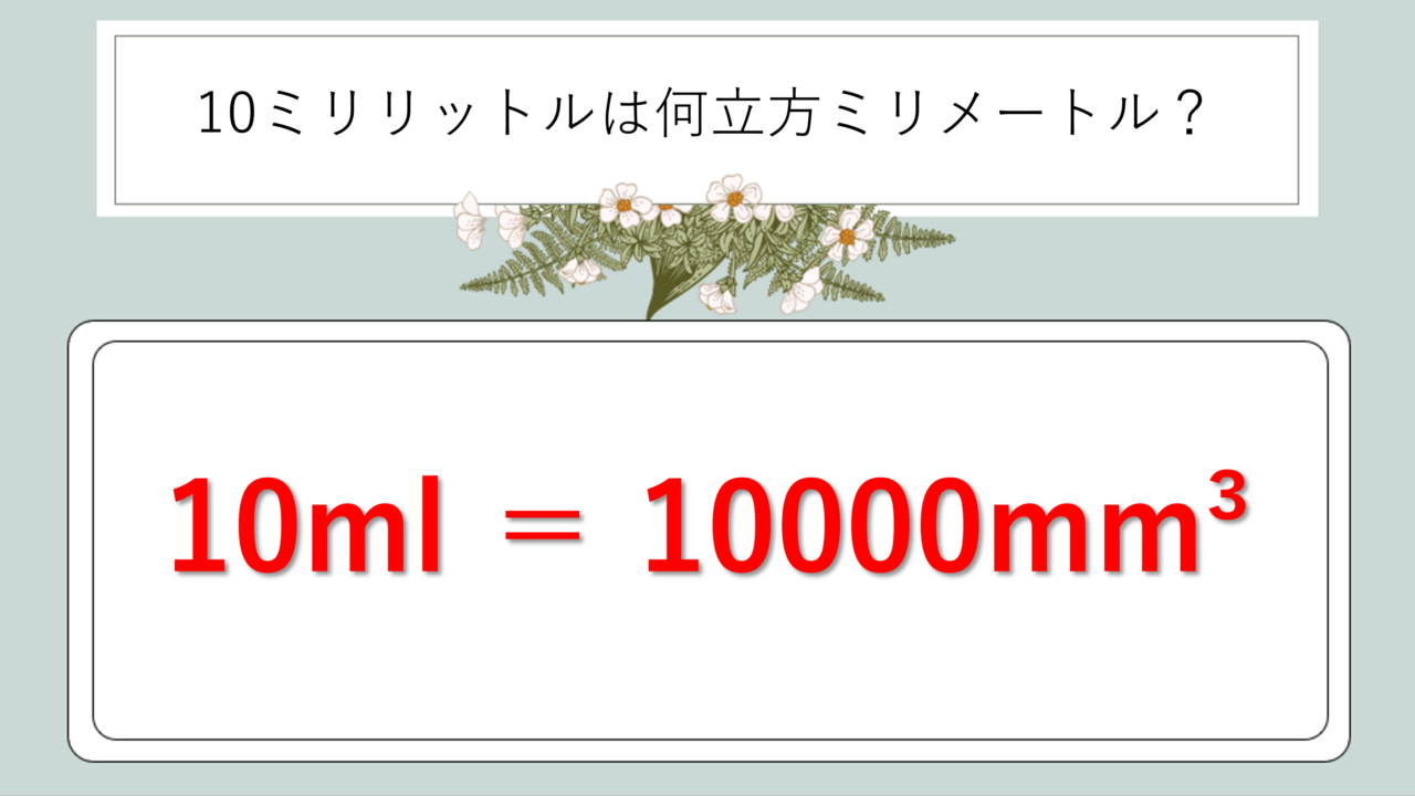 「1辺1cmの立方体の体積」をmmで表すと1000mm3になります。そして1ml = 1cm3 という等式が成り立つため、10ml = 10cm3 = 10000mm3 という関係が導かれます。