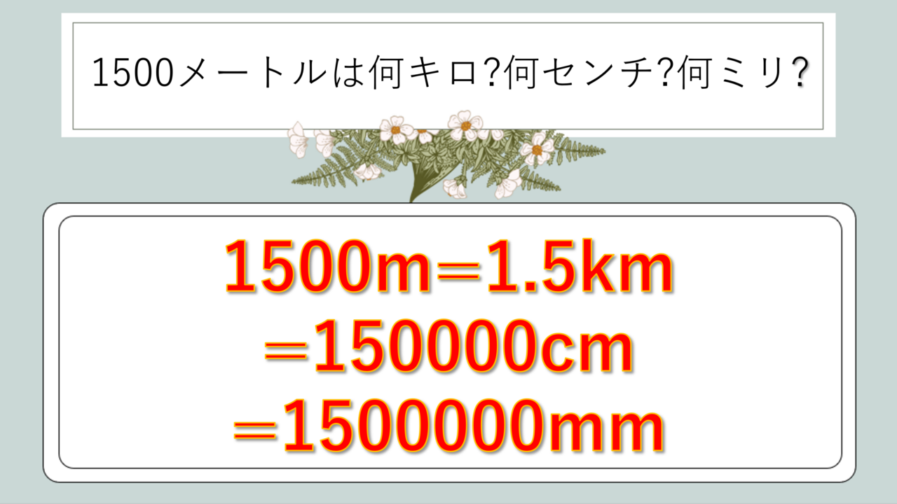 1500メートルは1.5キロメートル、150000センチメートル、1500000ミリメートルに換算されます。