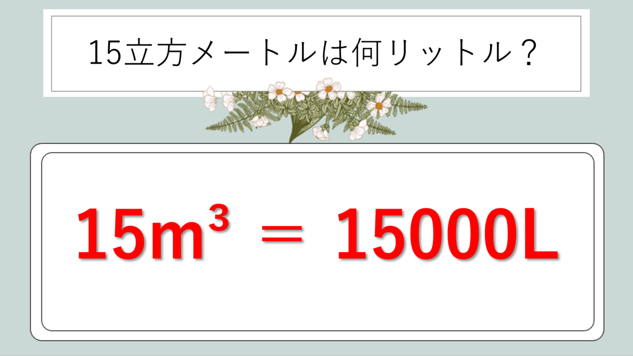 結論からお伝えすると、15m³=15000Lです。この数字が今回の記事でお伝えしたい最も重要な答えです。