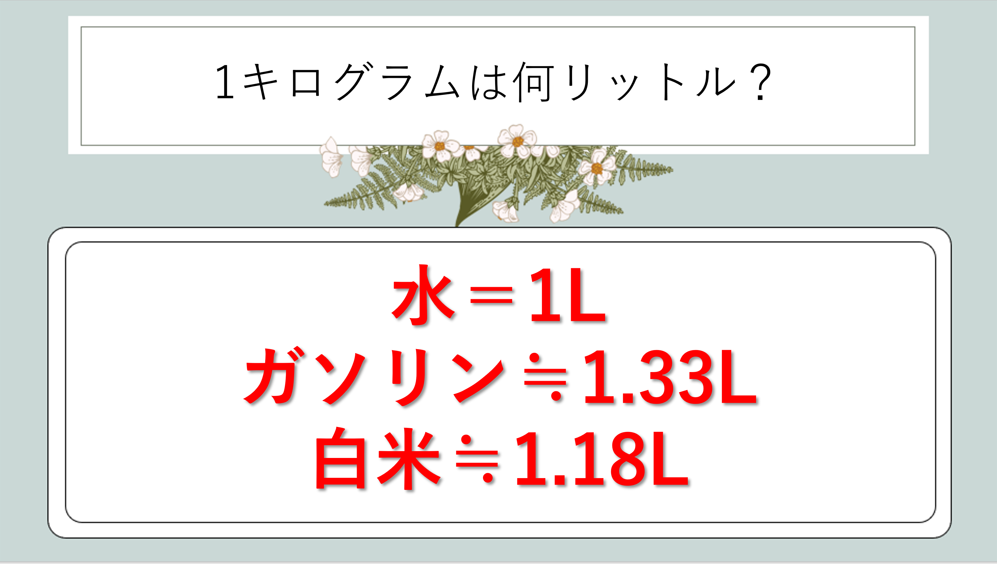 続いては、身近な液体素材について、1kgが何リットルになるのかを確認していきます。