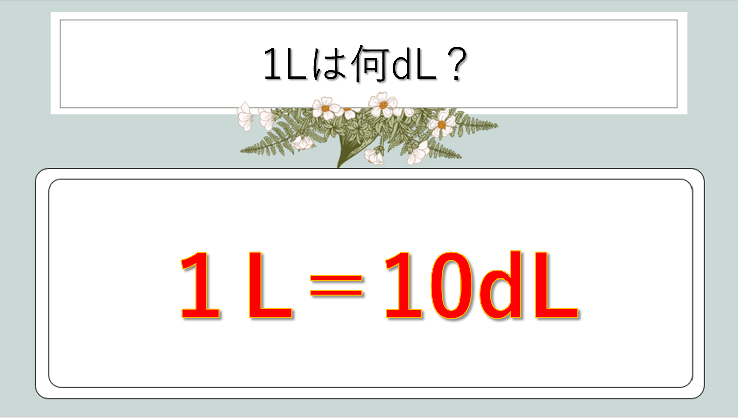 1リットル(1L)= 10デシリットル(10dl)これが単位変換の基本となる答えです。