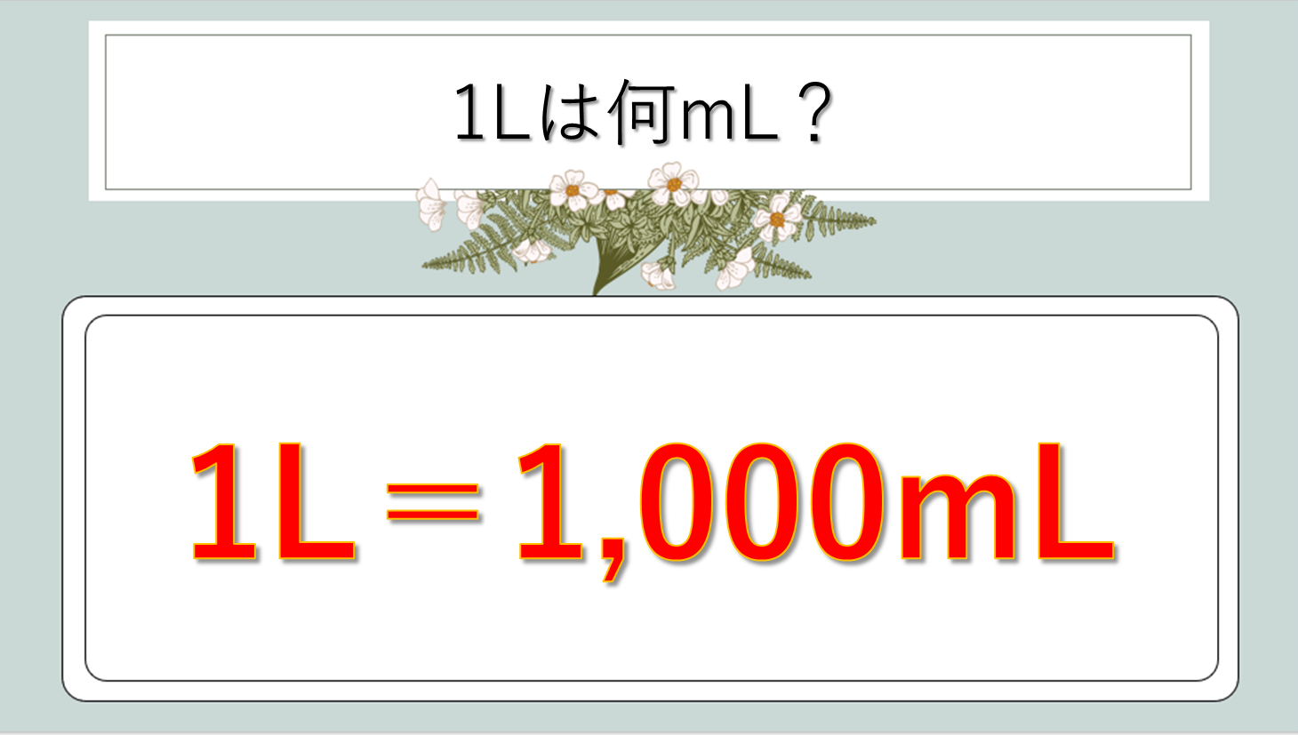 1L = 1000ml (これが最重要の基本)L → ml は ×1000(小数点を右に3つ)