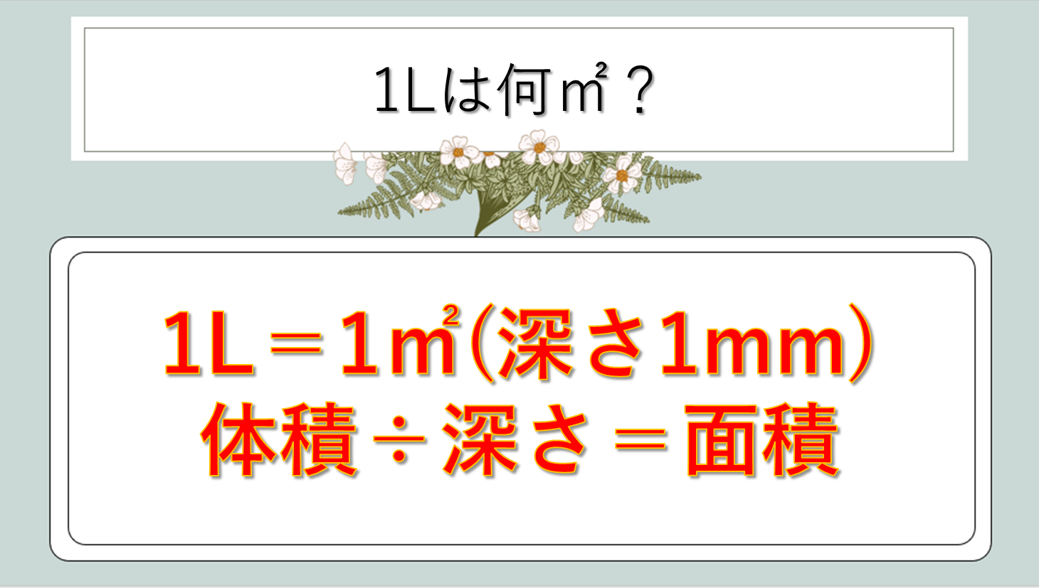 「1リットルを深さ1mmで広げると、ちょうど1平方メートルになる」これを基準に、深さが2倍になれば面積は半分、深さが半分になれば面積は2倍、と連想していきましょう。