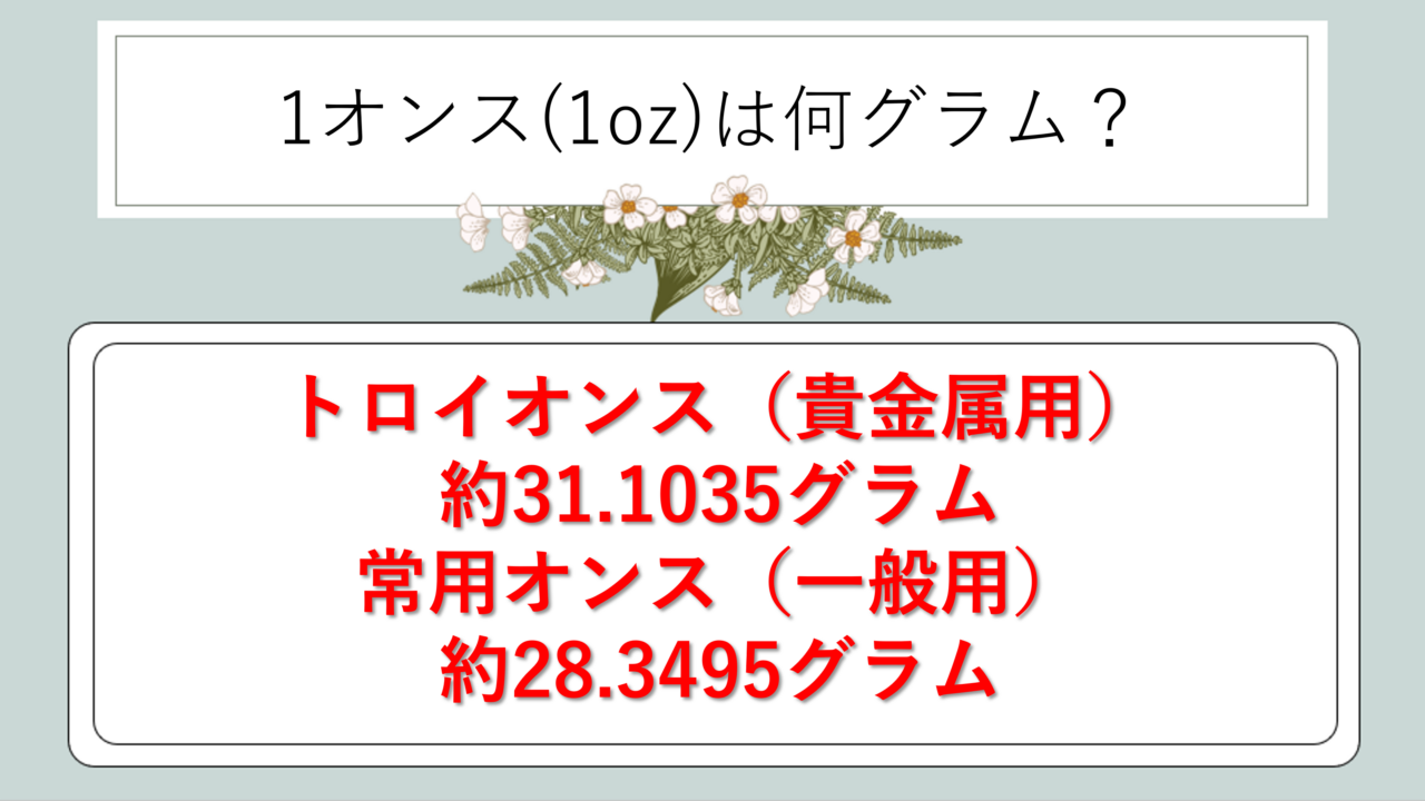 一方、食品や日用品などの一般的な重量を表す場合は、常用オンスが使われ、1オンス=約28.3495gとなります。トロイオンスと常用オンスでは約2.75gの差があるため、取り扱う製品がどちらのオンスを使っているか確認することが大切でしょう。