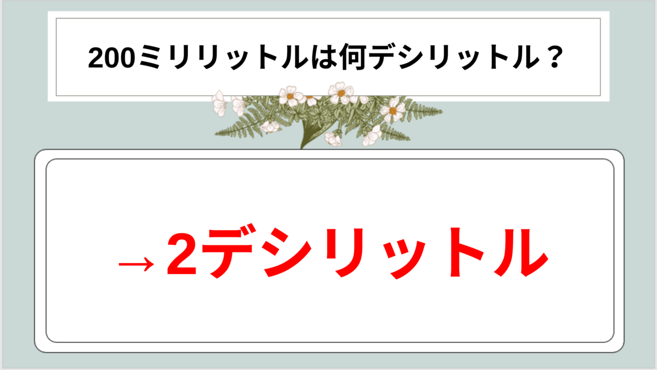 この計算からわかるように、200ミリリットルは2デシリットル、つまりちょうど2デシリットルという非常にわかりやすい量。日常生活でもよく使われる単位の関係なので、覚えておくと便利です。