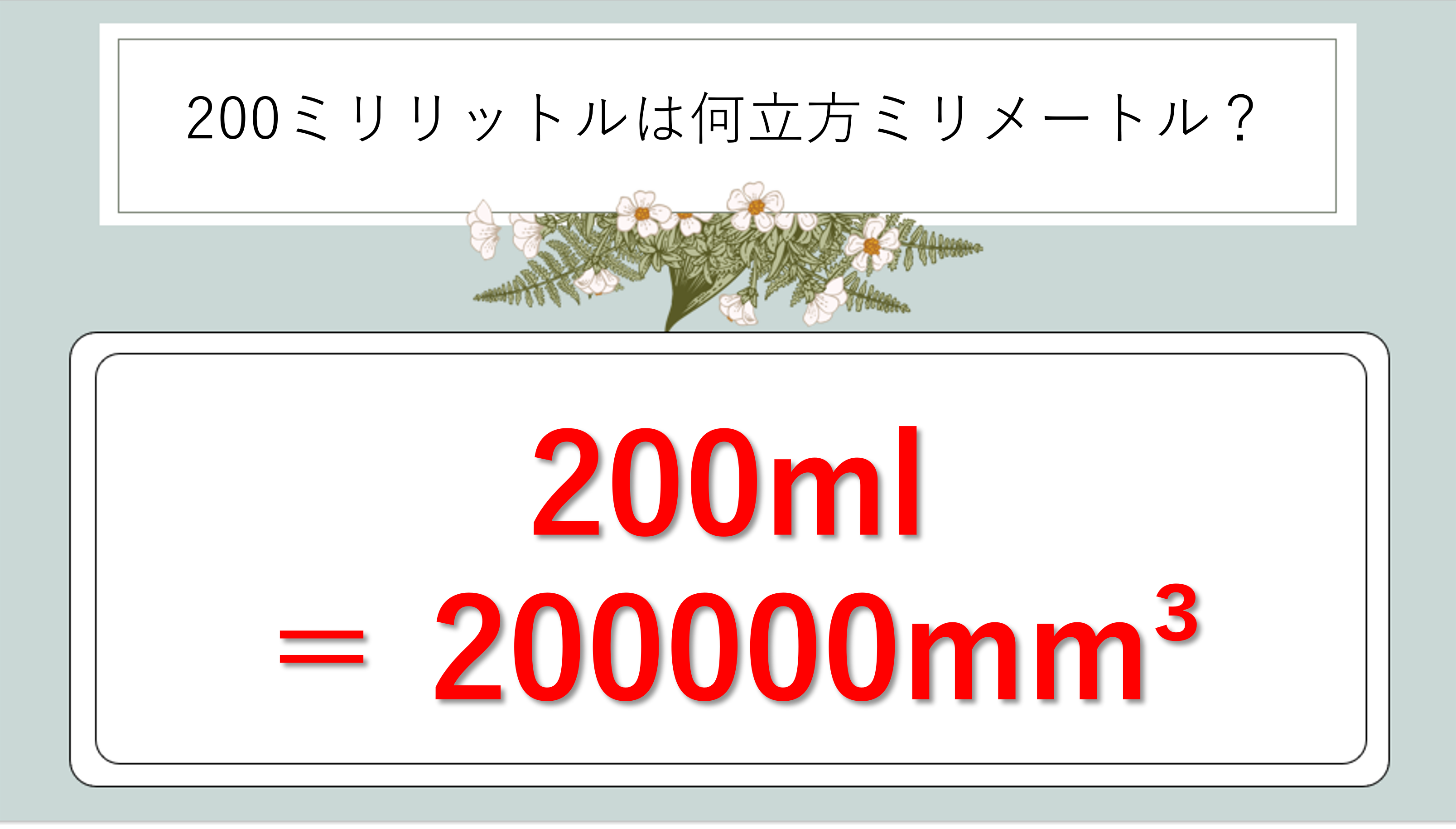 200ml(ミリリットル)は200000mm3(立方ミリメートル)である