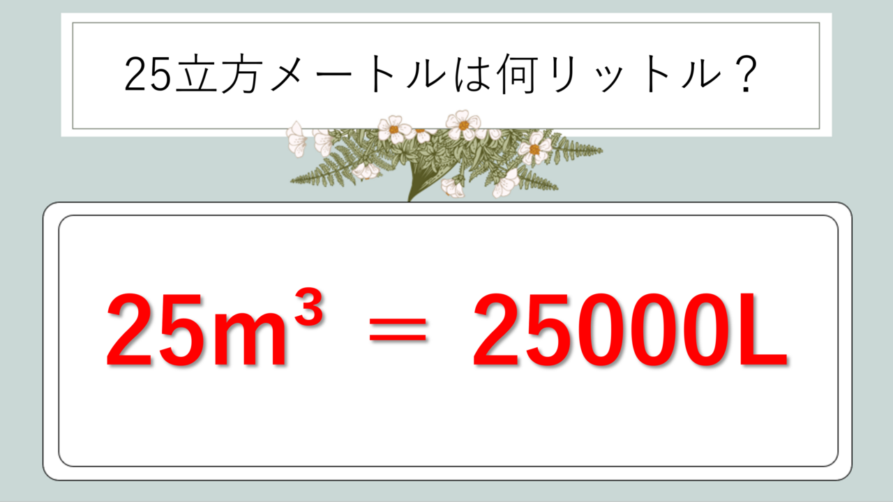 結論からお伝えすると、25m³=25000Lです。この数字が今回の記事でお伝えしたい最も重要な答えになります。