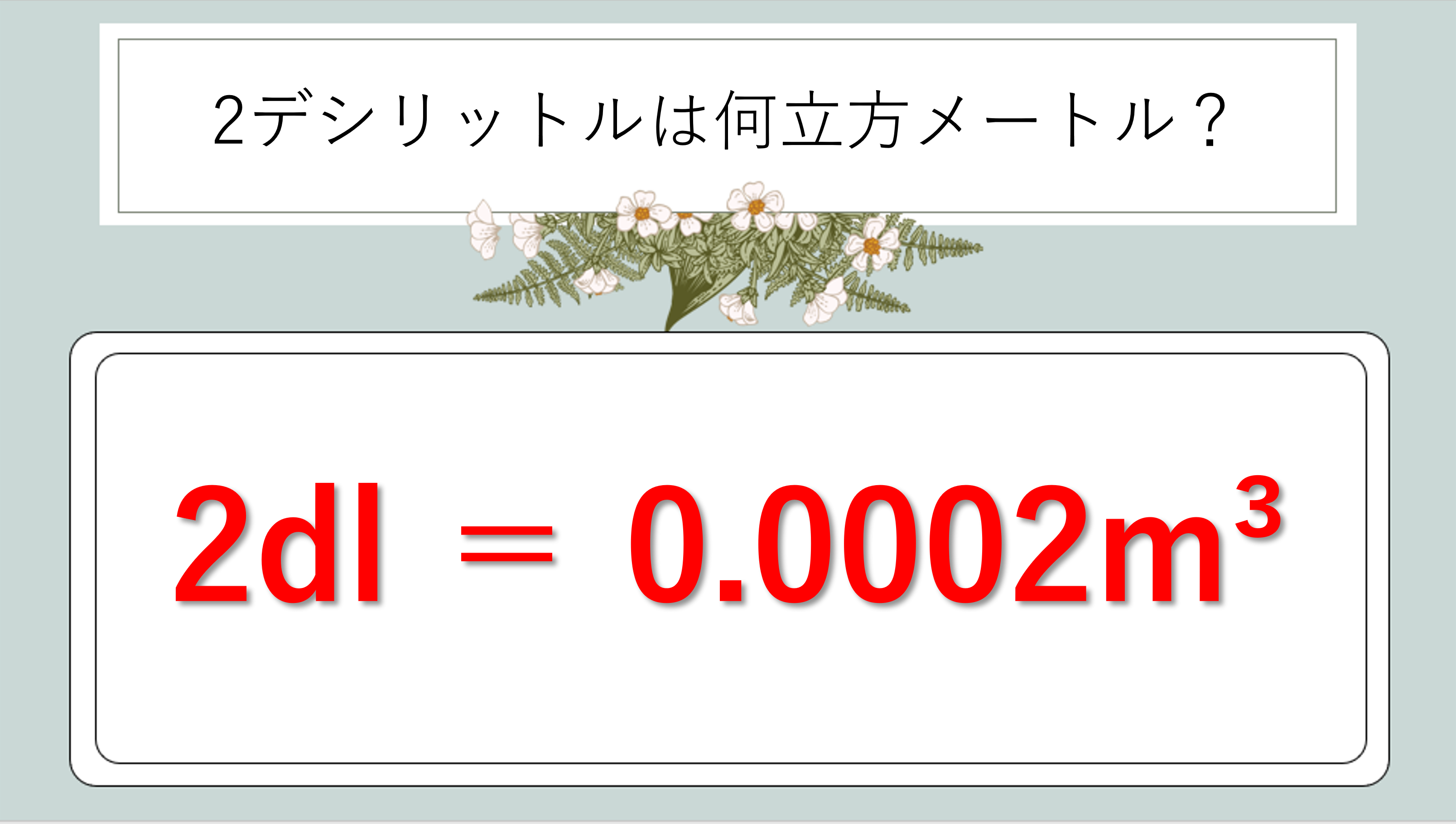 この関係式から、1デシリットル=0.0001立方メートルであることが導けます。そして2dlはその2倍ですから、2÷10000=0.0002m³となります。