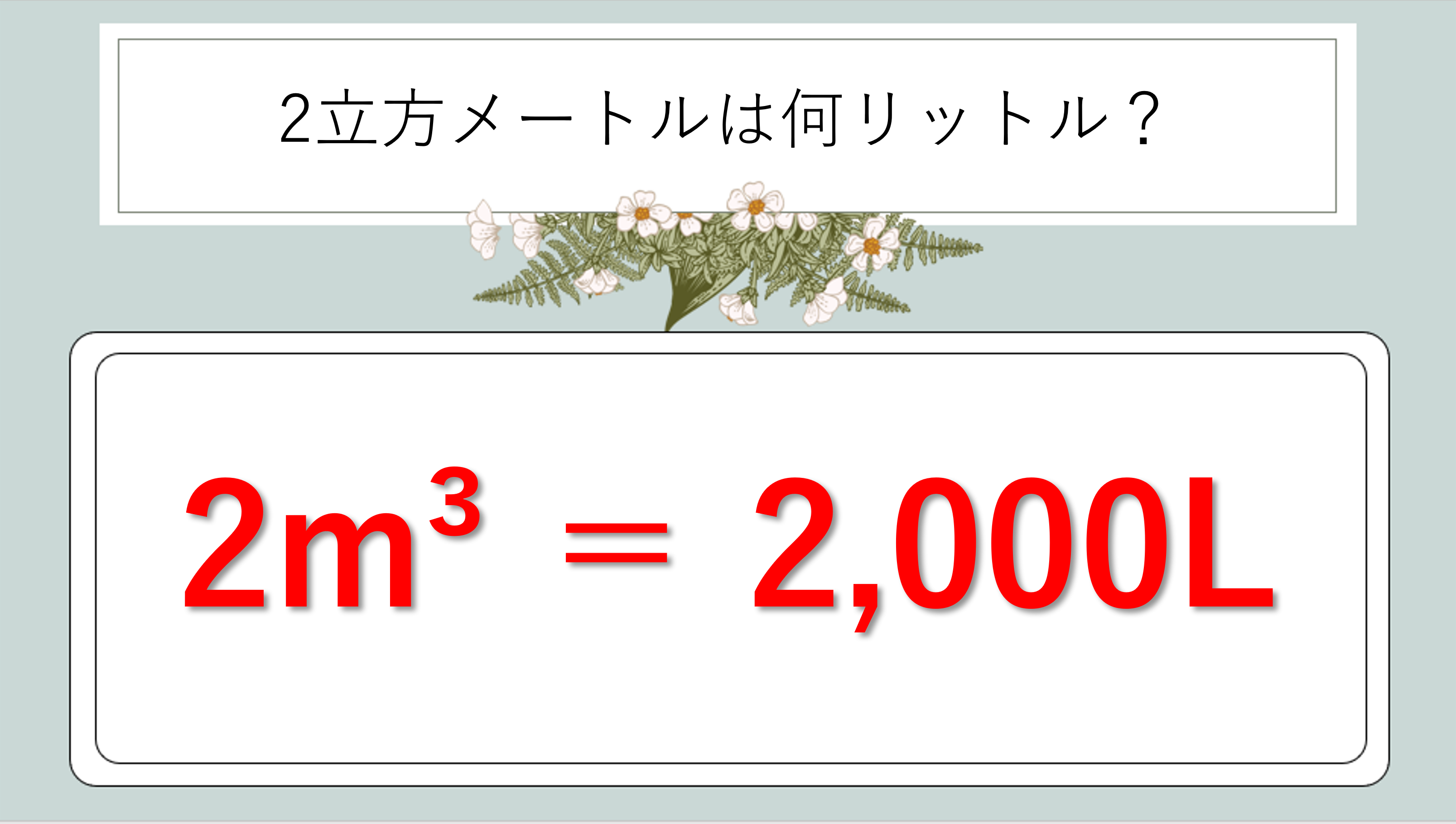 基本式「1m³ = 1,000L」に2を掛けるだけで導き出せます。
