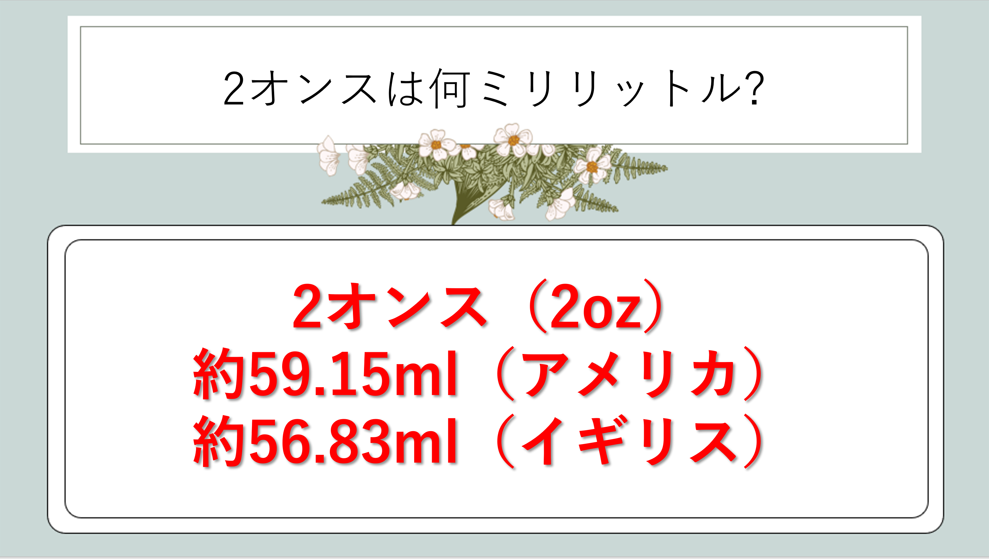 2オンス(2oz)は、アメリカ式では約59.15ml、イギリス式では約56.83mlとなります。一般的に使用されているのはアメリカ式で、日本で販売されている海外製品の多くもこの基準に基づいているでしょう。