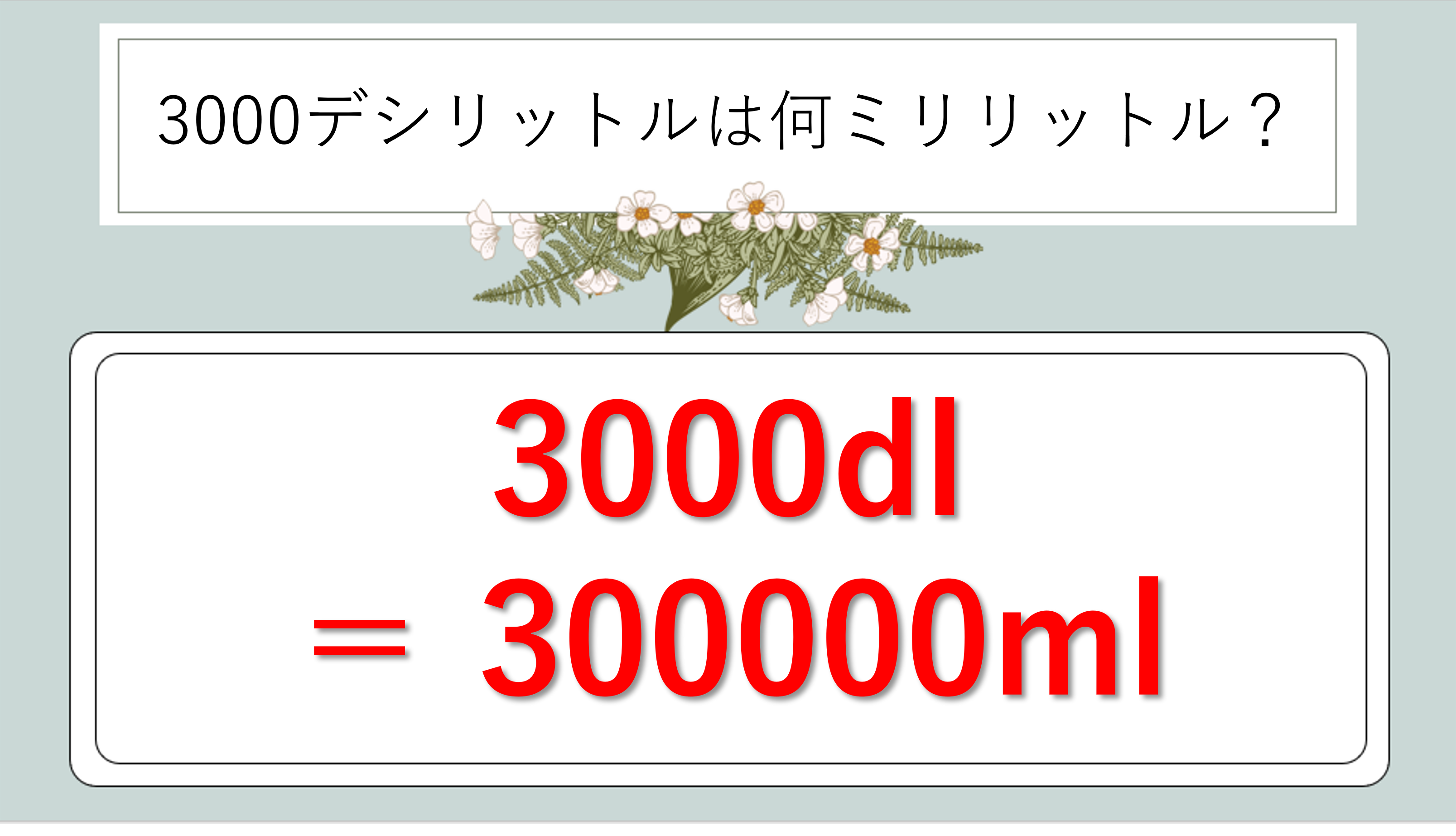 3000デシリットルは300000ミリリットル(3000dl=300000ml)