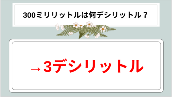 この計算からわかるように、300ミリリットルは3デシリットル、つまりちょうど3デシリットルという非常にわかりやすい量。日常生活でもよく使われる単位の関係なので、覚えておくと便利です。