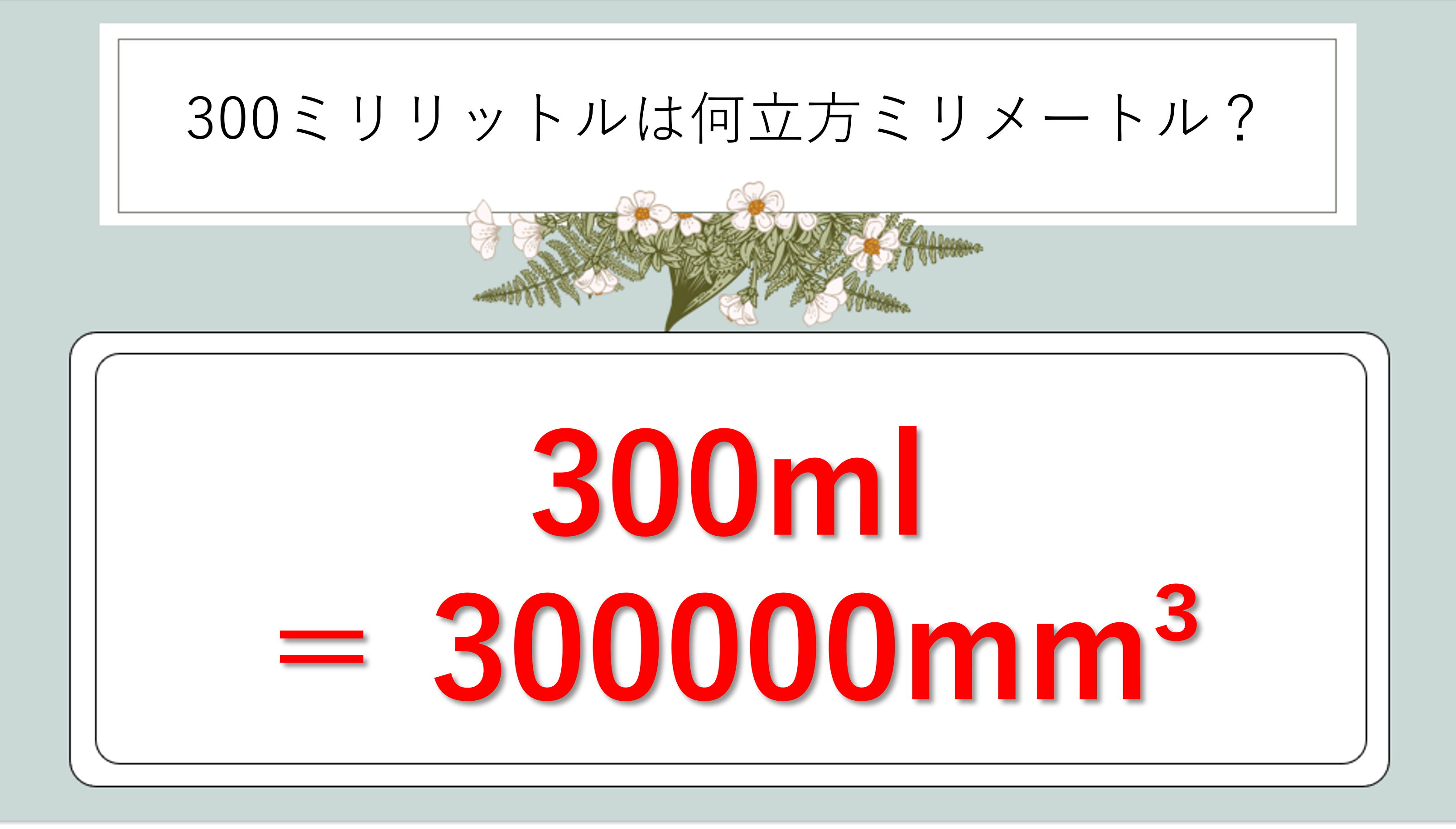 「1辺1cmの立方体の体積」をmmで表すと1000mm3になります。そして1ml = 1cm3 という等式から、300ml = 300cm3 = 300000mm3 という関係が自然に導かれます。