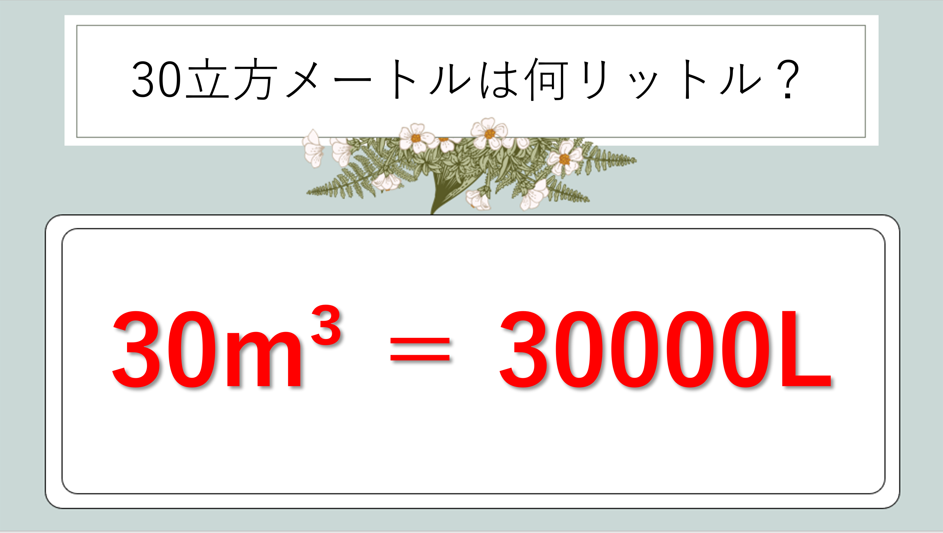 結論からお伝えすると、30m³=30000Lです。この数字が今回の記事でお伝えしたい最も重要な答えになります。