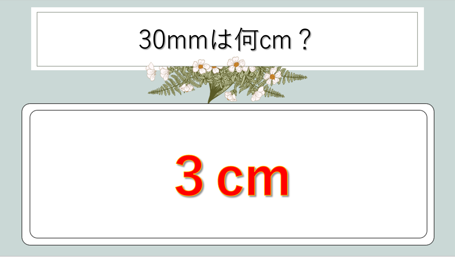答えは非常にシンプルで、30ミリメートルは3センチメートルになります。この換算は、ミリメートルとセンチメートルの関係を理解すれば、すぐに導き出せるでしょう。