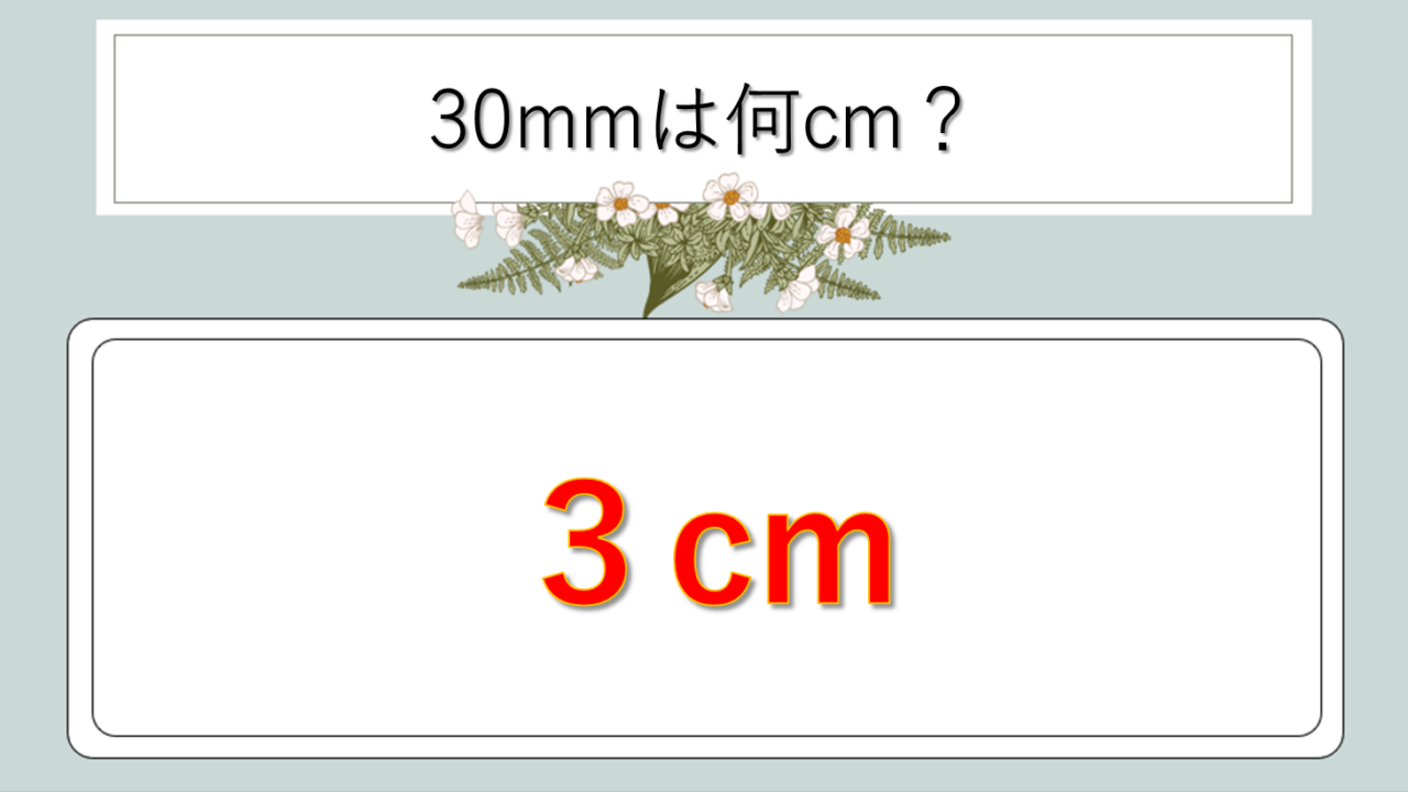 答えは非常にシンプルで、30ミリメートルは3センチメートルになります。この換算は、ミリメートルとセンチメートルの関係を理解すれば、すぐに導き出せるでしょう。