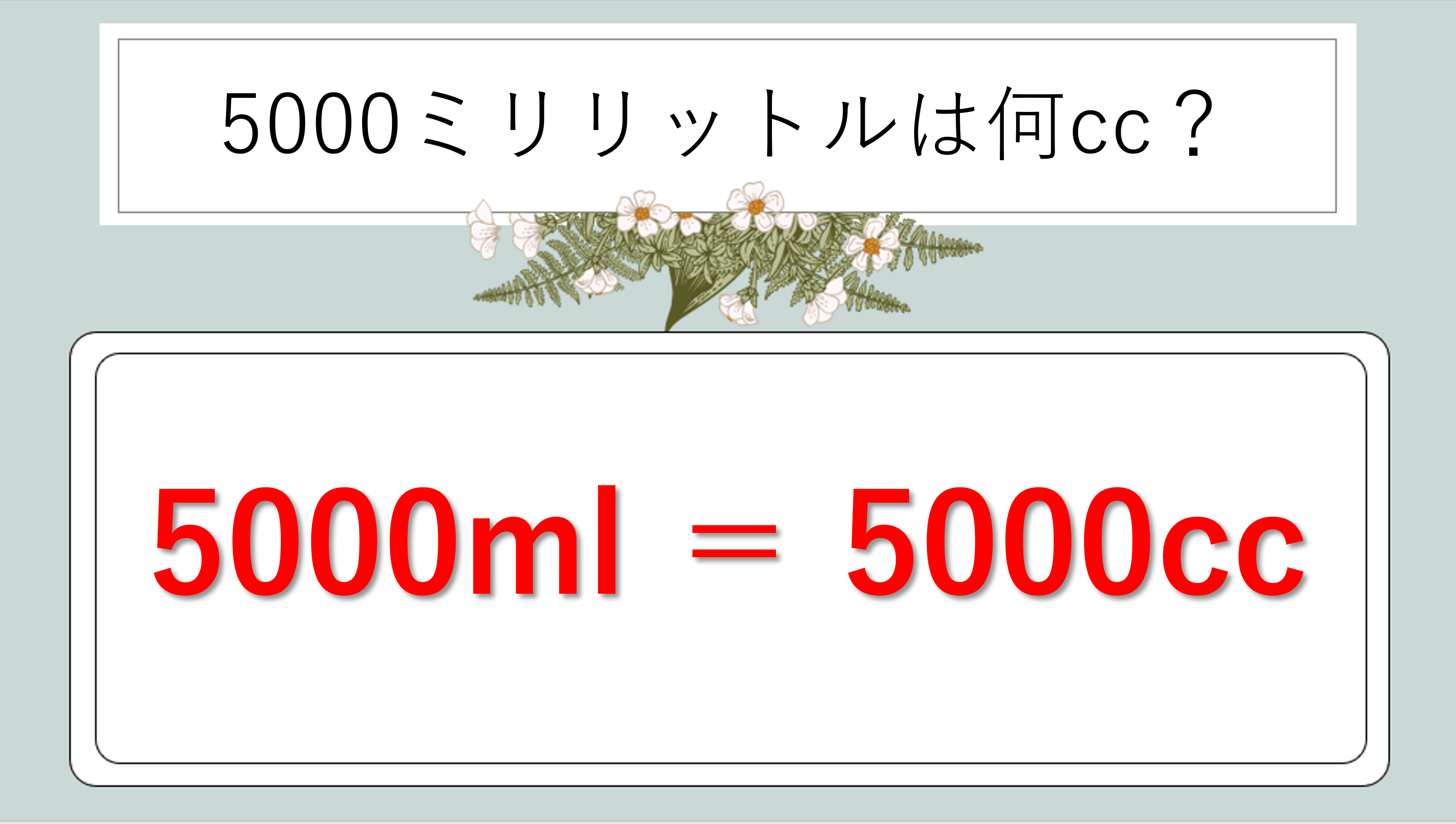 答え:5L × 1000 = 5000ml = 5000cc