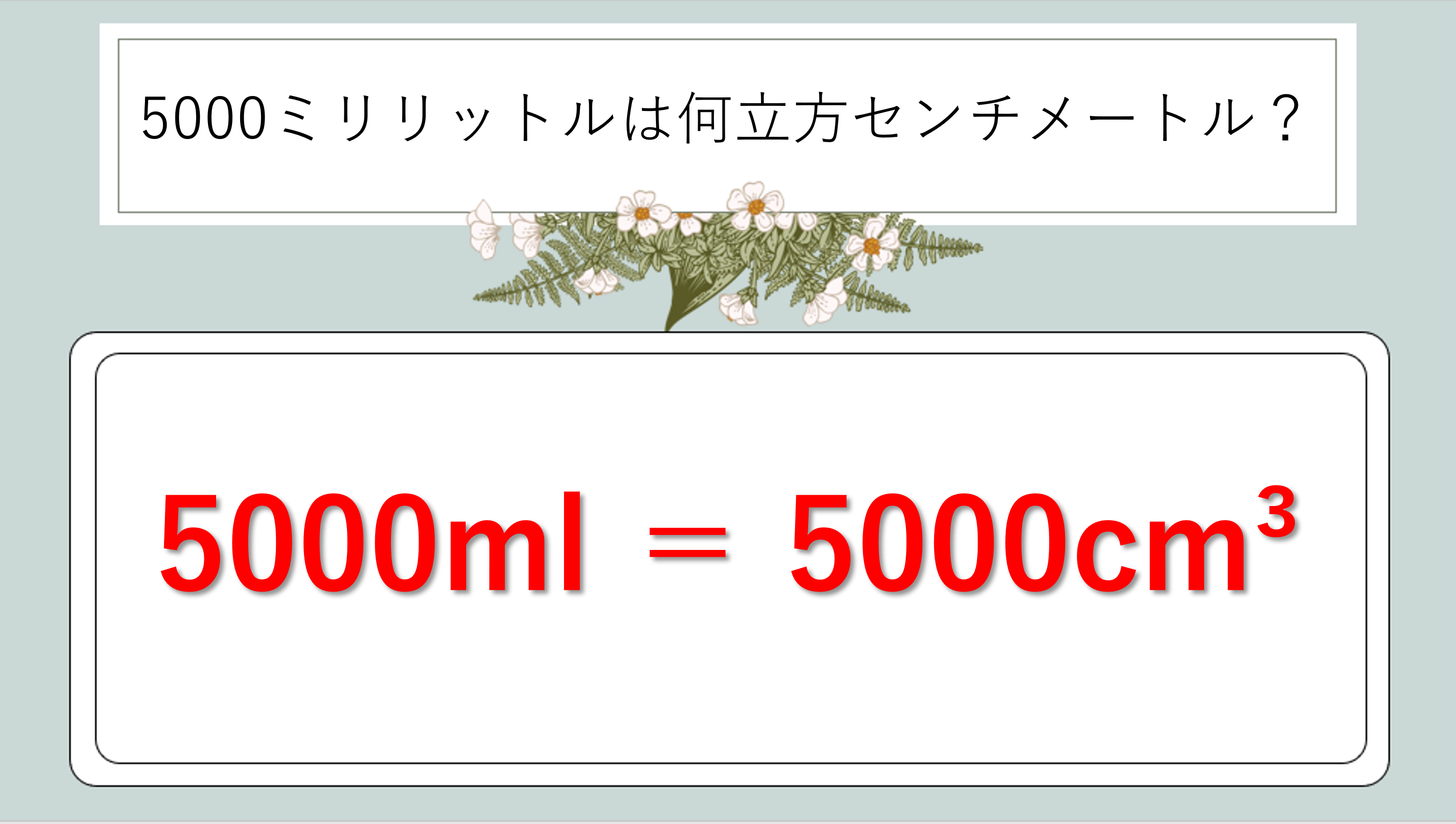 念のため、5000mlをcm3に変換する式も確認しておきましょう。