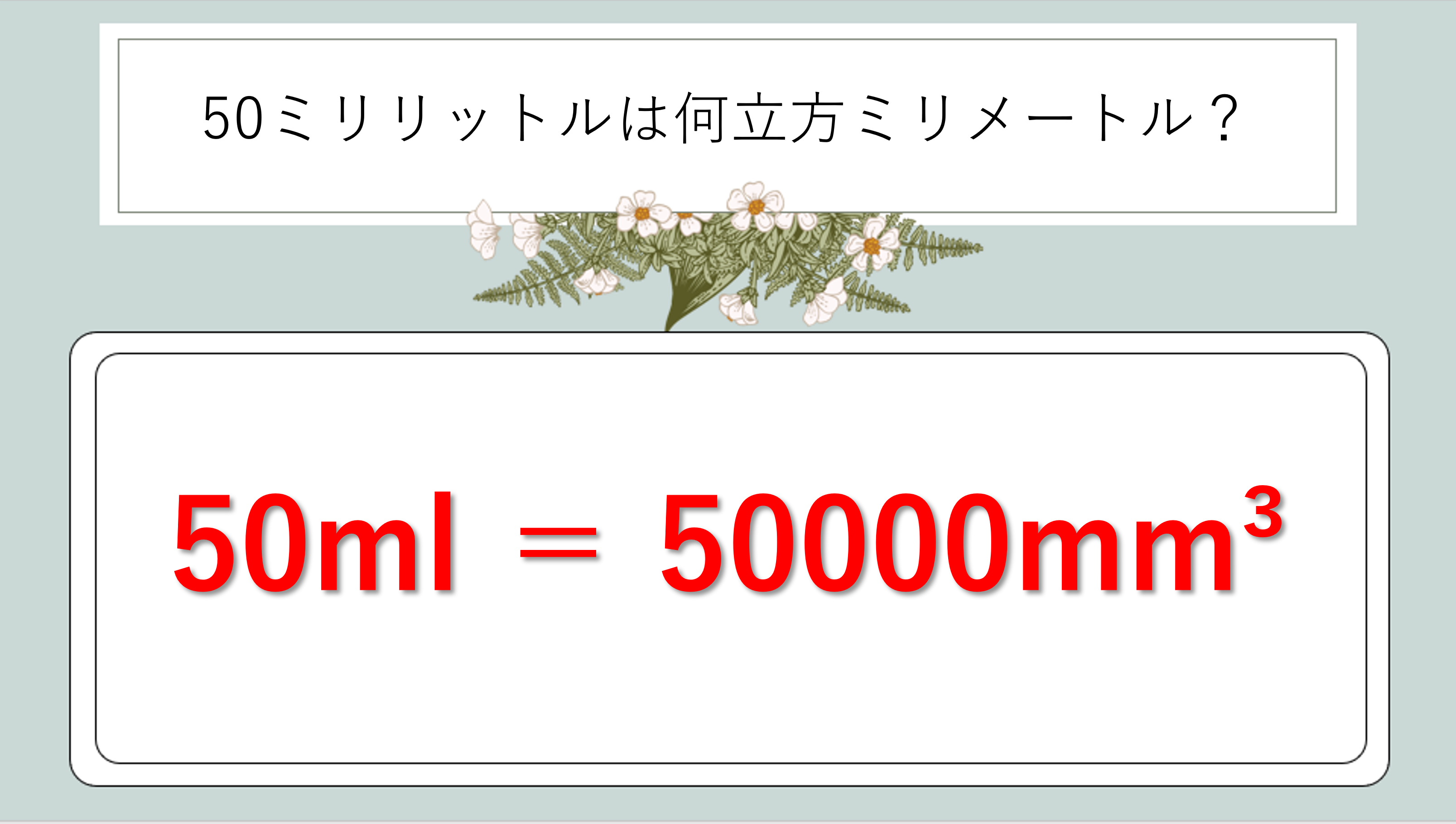 「1辺1cmの立方体の体積」をmmで表すと1000mm3になります。そして1ml = 1cm3 という等式から、50ml = 50cm3 = 50000mm3 という関係が導かれるわけです。