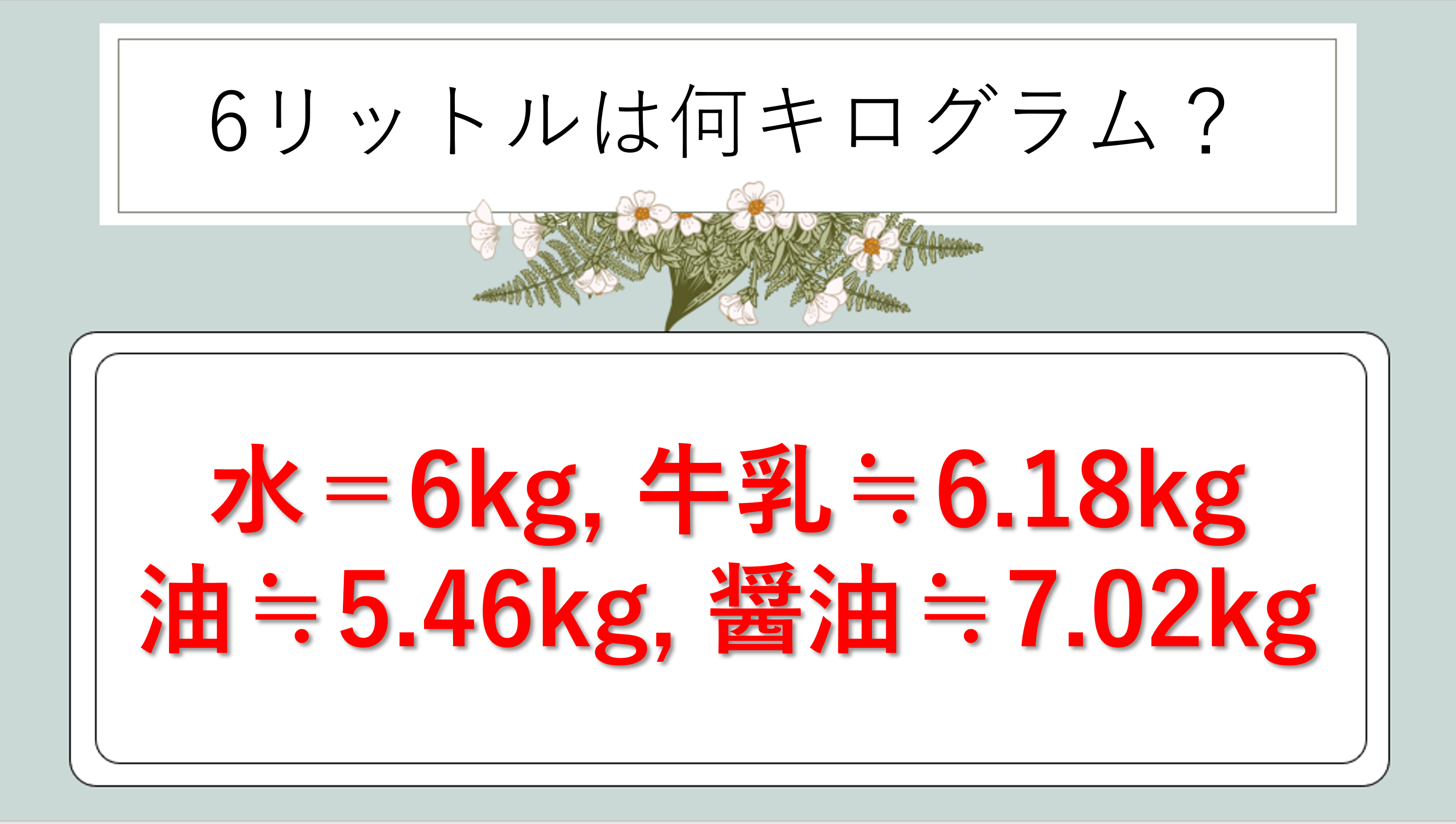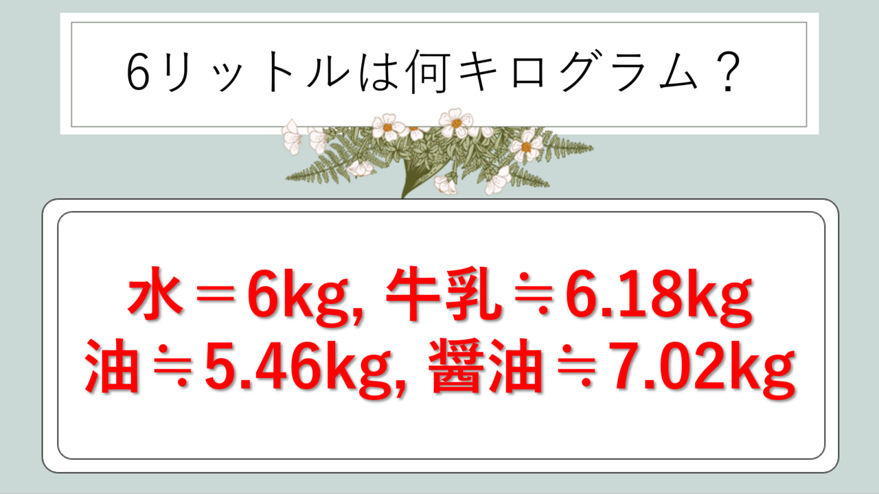 「6リットルは何キロになるの?」「6Lは何kgなの?」と疑問に思ったことはありませんか?