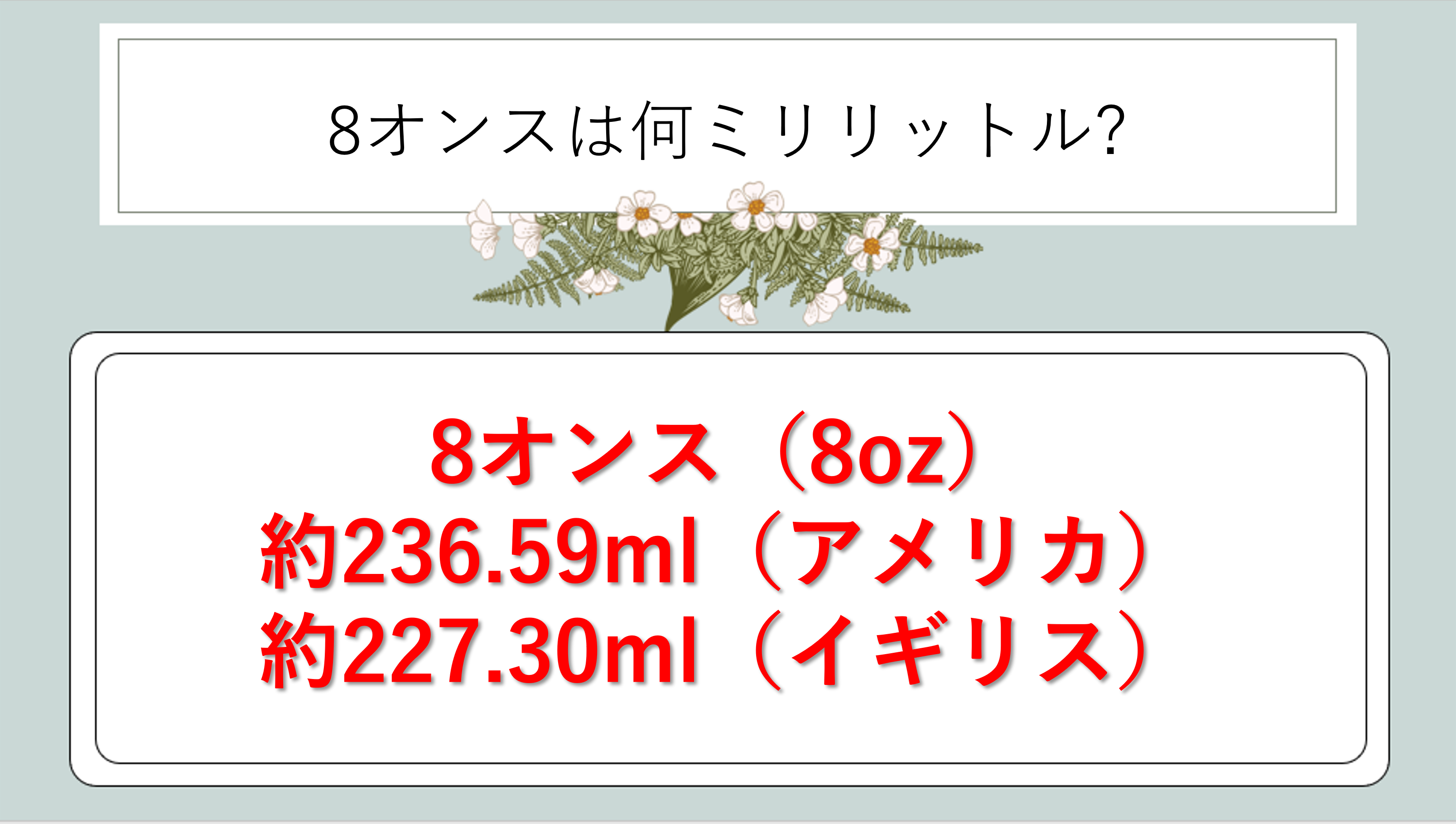 8オンス(8oz)は、アメリカ式では約236.59ml、イギリス式では約227.30mlとなります。一般的に使用されているのはアメリカ式で、日本で販売されている海外製品の大半もこの基準に基づいているでしょう。