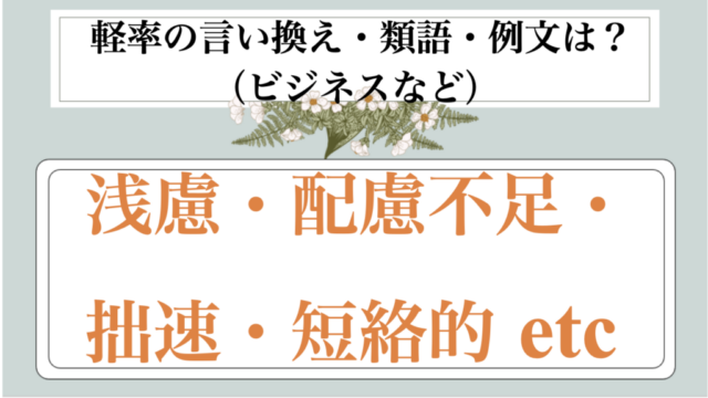 ビジネス用語 軽率|言い換え|ビジネス|丁寧な言い方|柔らかい言い方|かっこいい|例文|メール|敬語)【目上や上司や部下など】 rieko.o 白丸くん この記事では、軽率|別の言い方に言い換え(ビジネス|別の言い方|例文|丁寧なメール|敬語)【目上や上司や部下など】について解説していきます。 …
