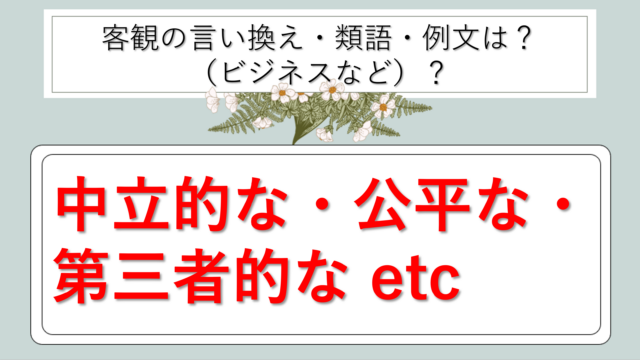 ビジネス用語 客観|言い換え|ビジネス|丁寧な言い方|柔らかい言い方|かっこいい|例文|メール|敬語)【目上や上司や部下など】 hoppy.yuppy 白丸くん この記事では、客観|別の言い方に言い換え(ビジネス|別の言い方|例文|丁寧なメール|敬語)【目上や上司や部下など】について解説していきます。 …