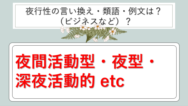 ビジネス用語 夜行性|言い換え|ビジネス|丁寧な言い方|柔らかい言い方|かっこいい|例文|メール|敬語)【目上や上司や部下など】 hoppy.yuppy 白丸くん この記事では、夜行性|別の言い方に言い換え(ビジネス|別の言い方|例文|丁寧なメール|敬語)【目上や上司や部下など】について解説していきます …
