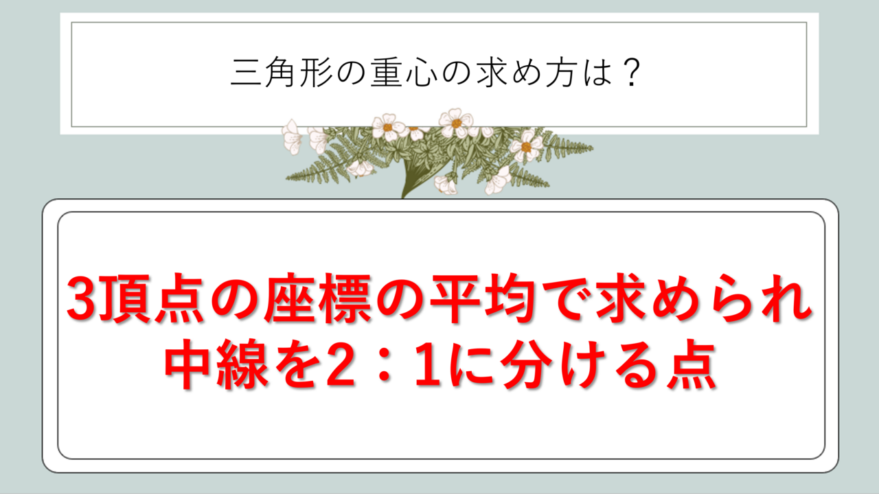が重心の座標になるという非常にシンプルな公式です。3頂点の座標を足して3で割るだけで求められるため、計算ミスが起こりにくい公式といえるでしょう。