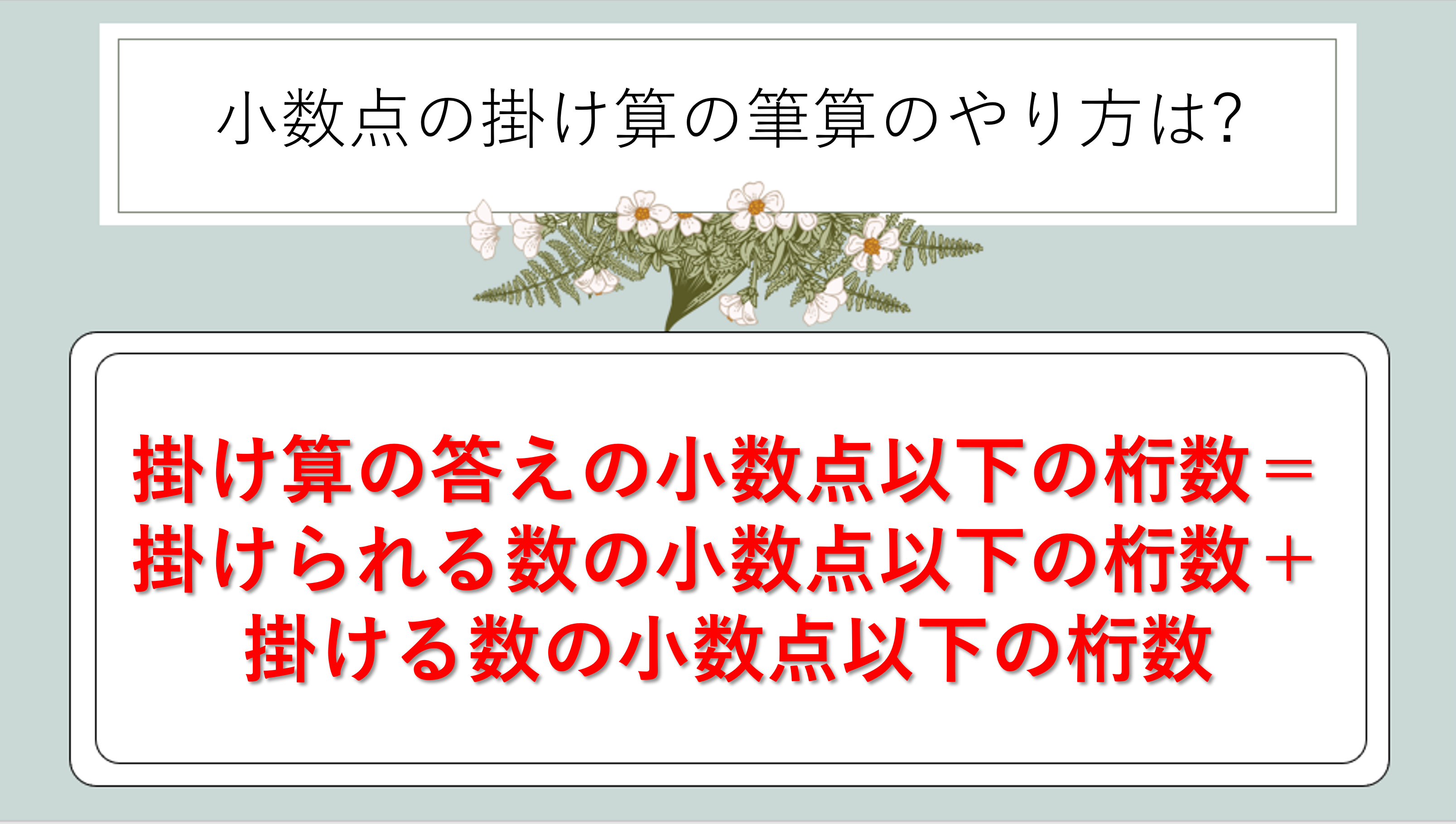 掛け算の答えの小数点以下の桁数=掛けられる数の小数点以下の桁数+掛ける数の小数点以下の桁数