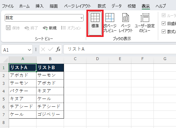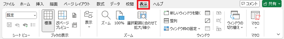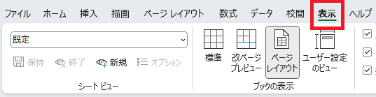 次に、表示モードを確認します。「表示」タブをクリックして、現在のビューを確認しましょう。