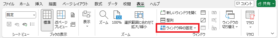「ウィンドウ」グループにある「ウィンドウ枠の固定」ボタンをクリックしましょう。