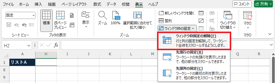 – ウィンドウ枠の固定解除:「表示」タブ→「ウィンドウ枠固定の解除」で固定を解除