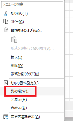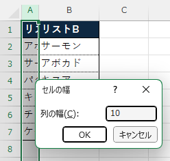 A列の列番号を右クリック → 「列の幅」を選択 → 適切な数値(例:10)を入力