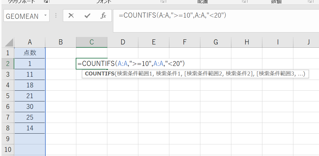 「10以上20未満」のデータ個数をカウントしたい場合、任意のセル(例としてC2)に以下のような数式を入力します。