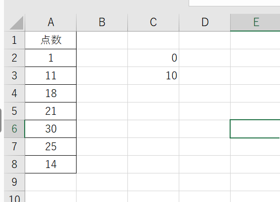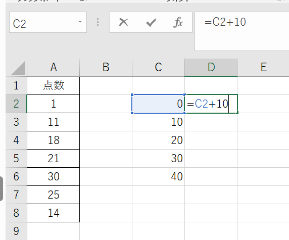 まずC2セルに「0」と入力し、C3セルに「10」と入力します。