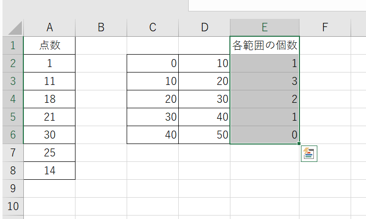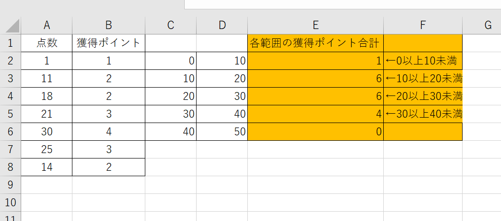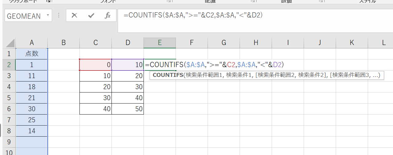 この数式をE3, E4, E5…と下方向にコピーすれば、各行の下限値・上限値を自動的に参照して集計されます。