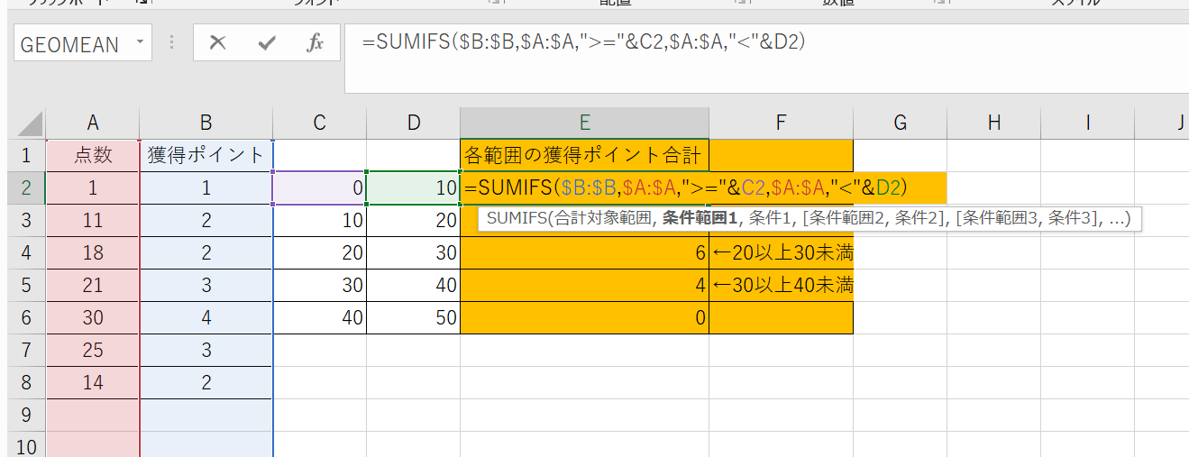 例えばA列に点数、B列に獲得ポイントがあり、「点数が10以上20未満のデータの獲得ポイント合計」を求める場合、セル参照を使って以下のように記述します。
