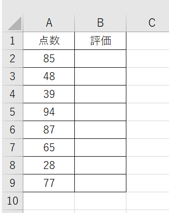 例えば点数に応じてA・B・C・Dの評価を付ける場合、以下のように記述しましょう。