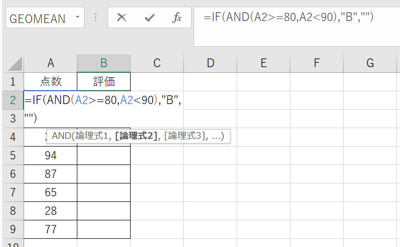 「80点以上90点未満ならばB」と判定したい場合、B2セルに以下のような数式を入力します。