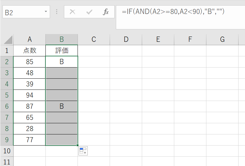 AND関数内の条件がすべて満たされた場合(80以上かつ90未満)のみ「B」が表示され、条件を満たさない場合は空白になります。