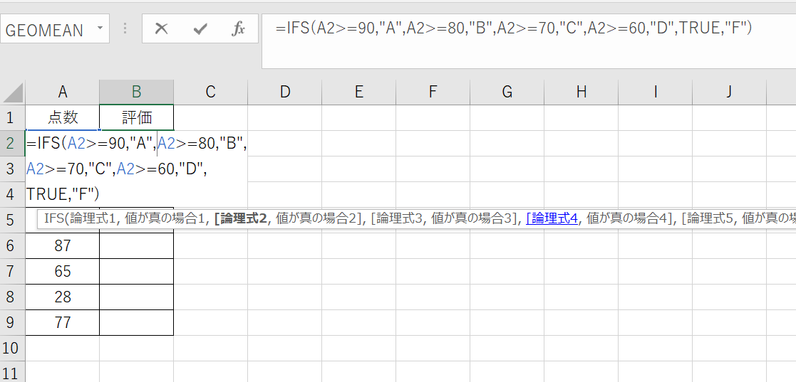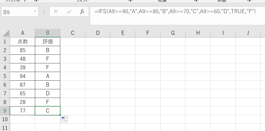 エクセルで複数の範囲条件(90点以上はA、80点以上90点未満はBなど)を判定する方法2【IFS関数での階層的判定】