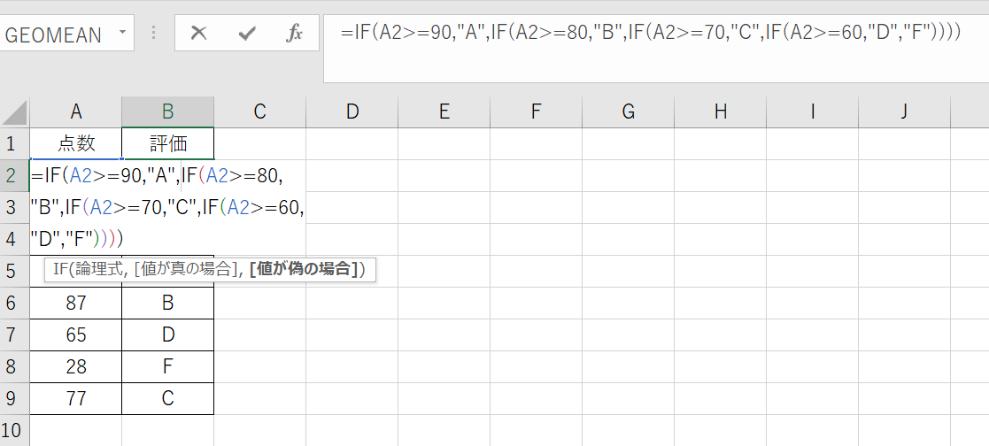 これにより「90点以上はA」「80点以上90点未満はB」「70点以上80点未満はC」といった複数階層の判定が効率的に行えます。