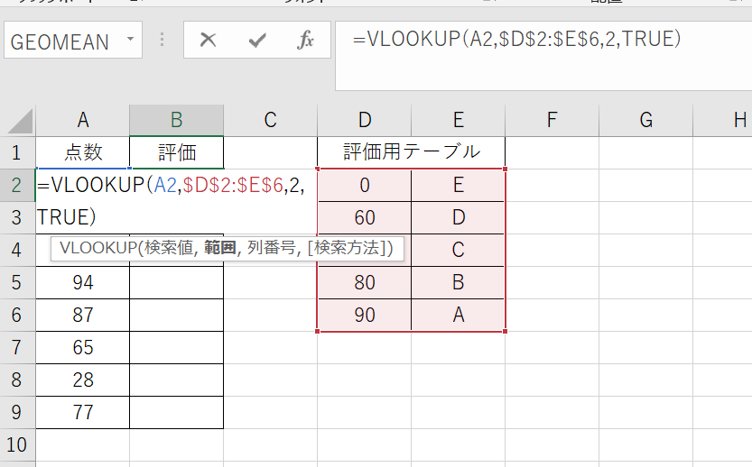 この基準表を使って、VLOOKUP関数で評価を自動判定します。